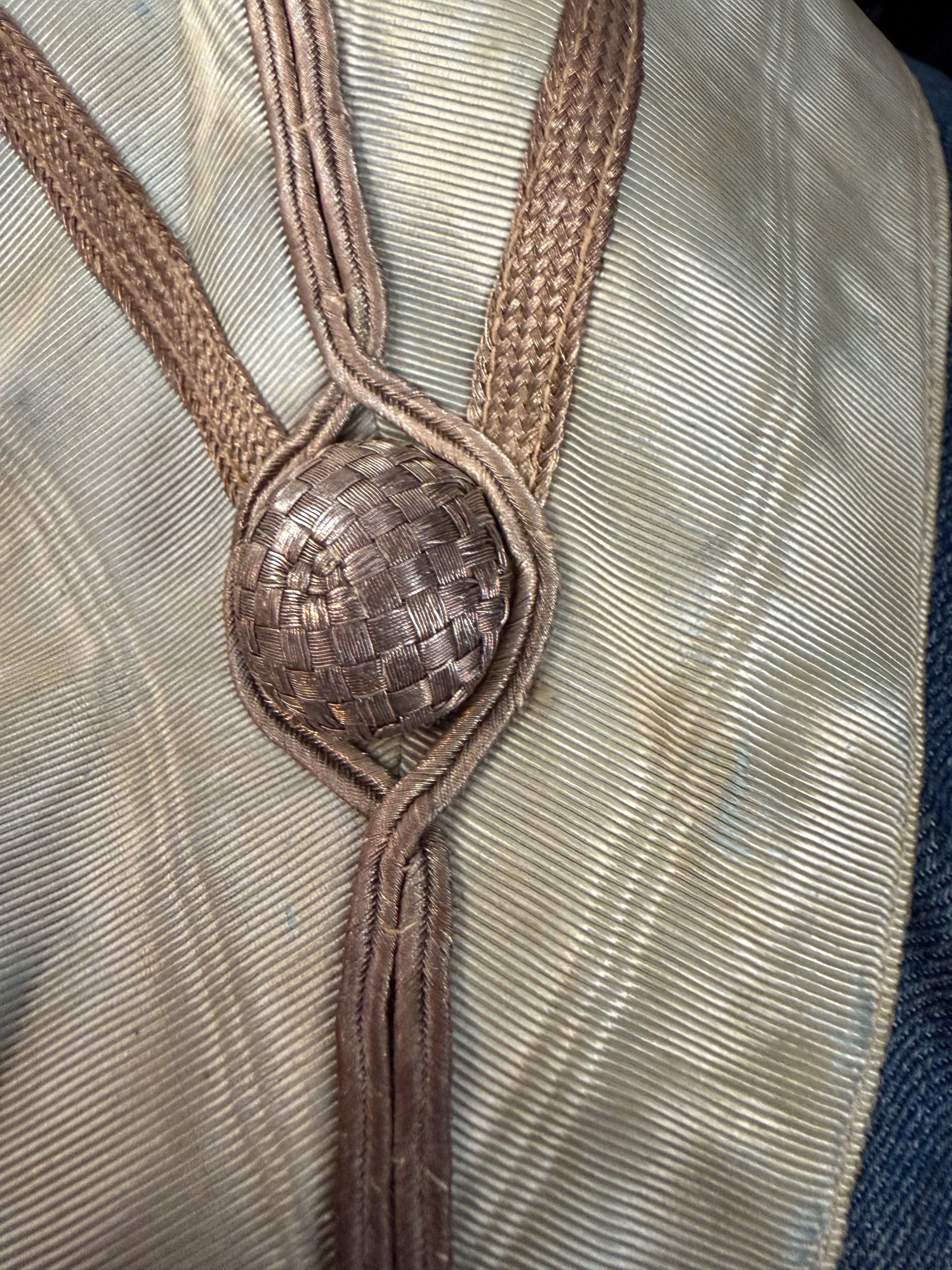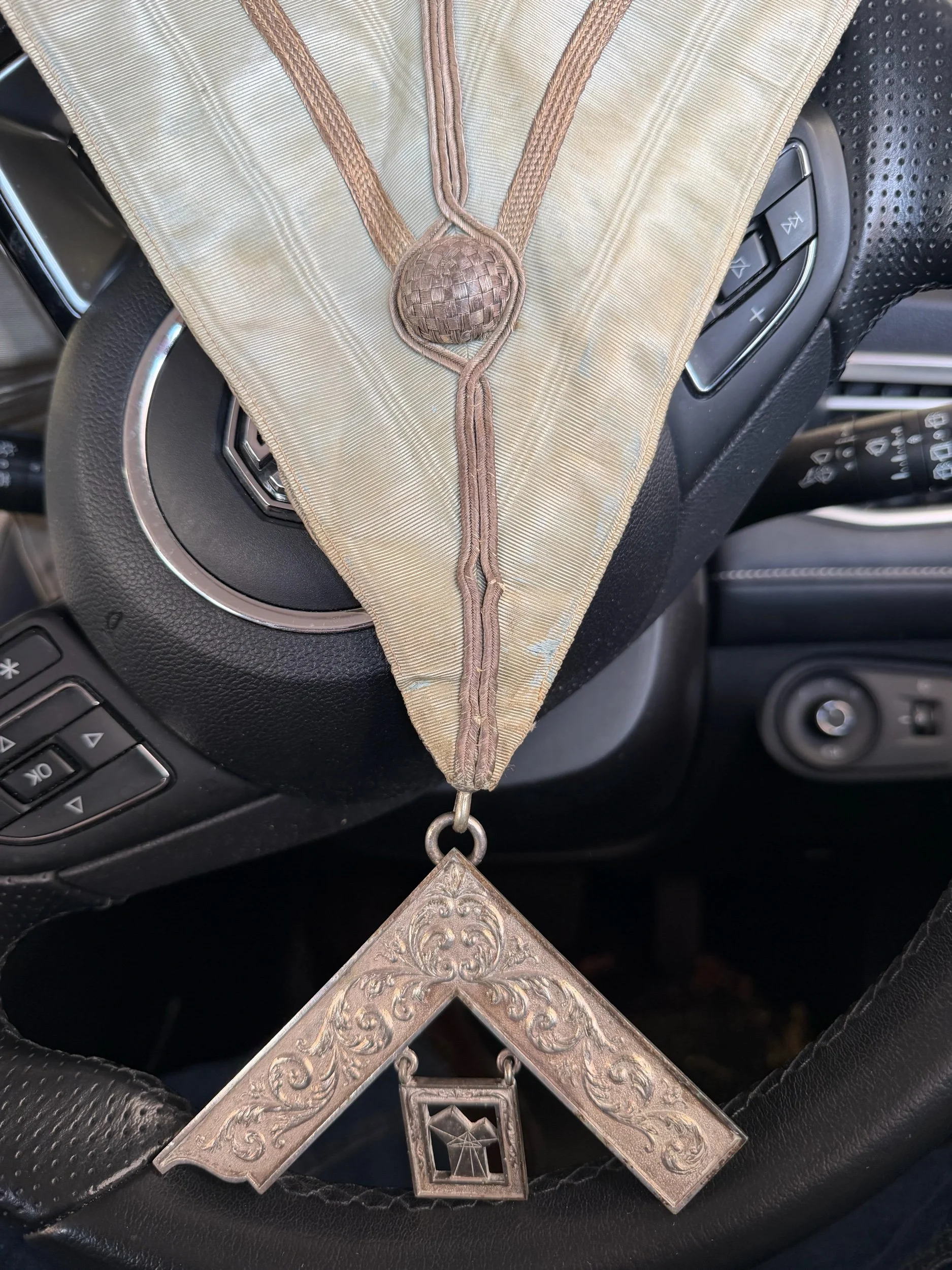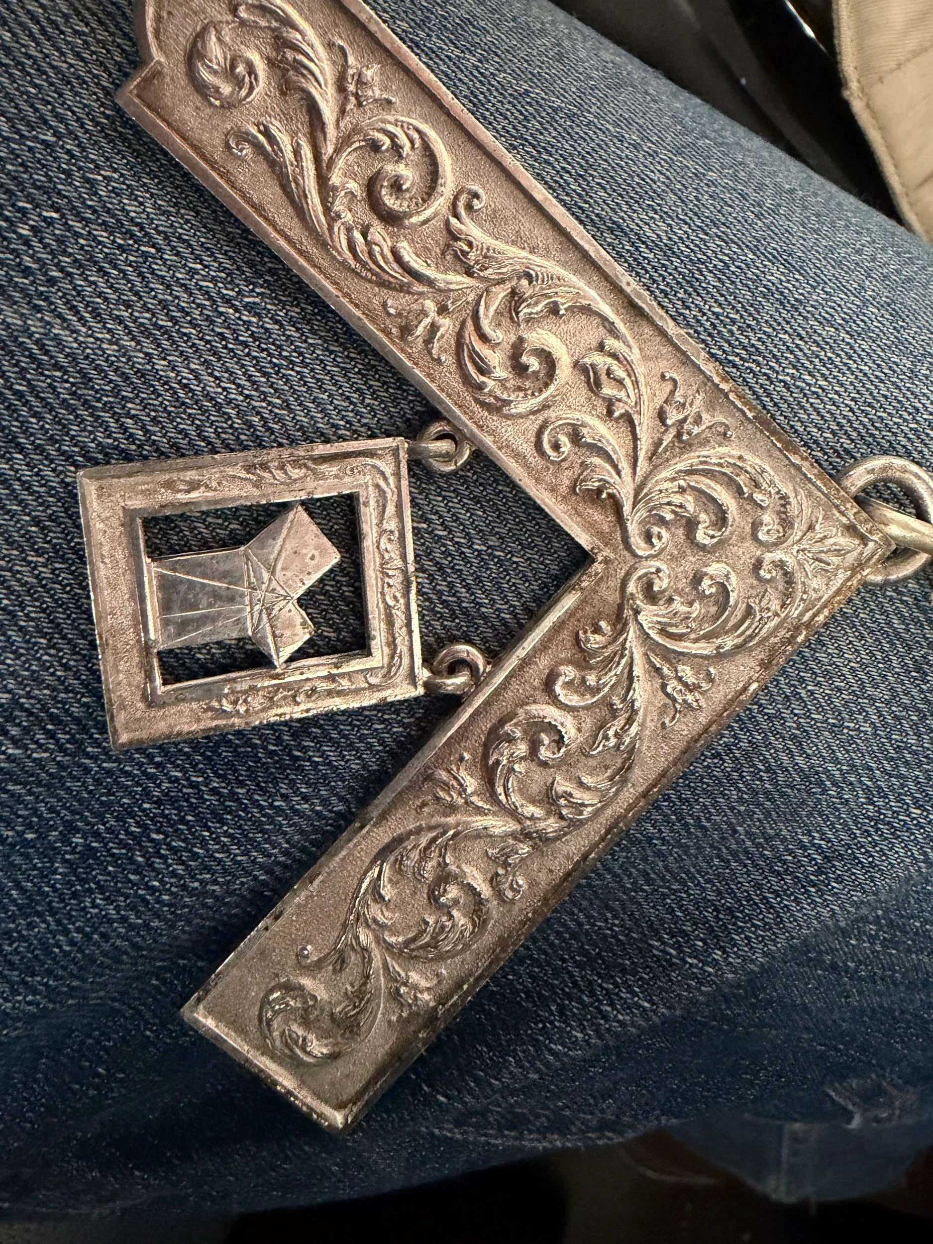 This is believed to be a c1880s-1910s Masonic Past Master collar. There is no hallmark but on the back there appears to be a hand-stamped TUYER GB LONDON. The collar itself I believe was blue watered silk. There are still bits of the blue though mostly faded.